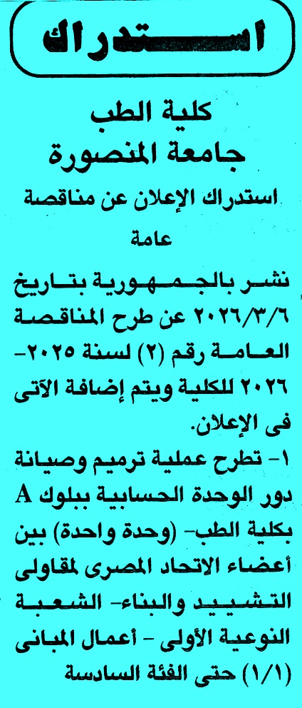 استدراك مناقصة عامة رقم 2 لسنة 2026/2025م عن عملية ترميم وصيانة دور الوحدة الحسابية ببلوك