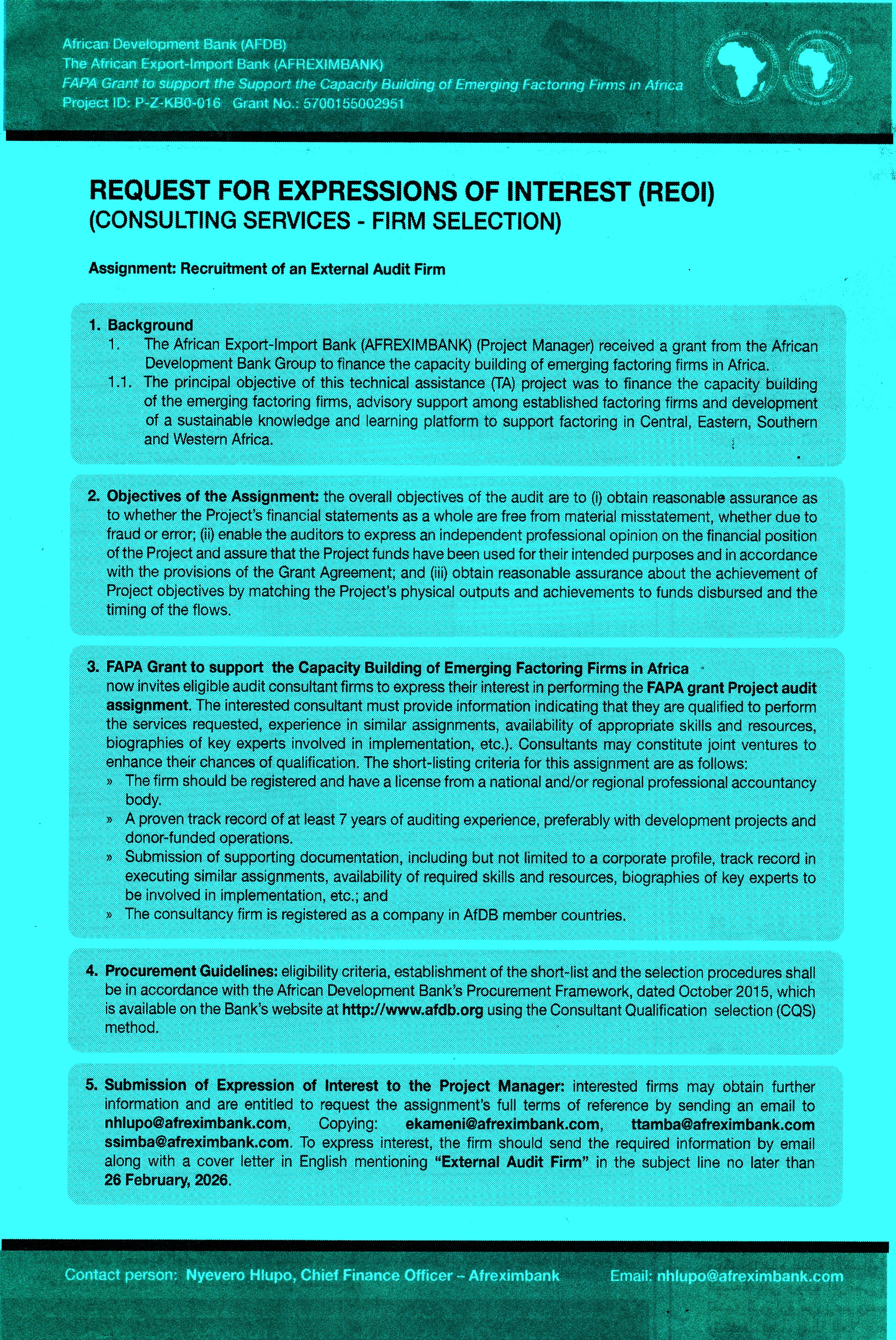 | الهيئه | African Development Bank (AFDB) The African Export-Import Bank (AFREXIMBANK) FAPA Grant to support the Support the Capacity Building of Emerging Factoring Firms in Africa |