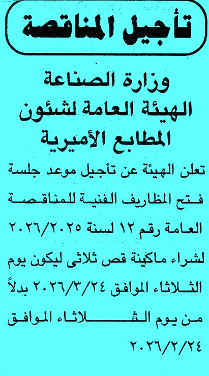تاجيل مناقصة عامة رقم 12 لسنة 2026/2025 عن عملية لشراء ماكينة قص ثلاثي