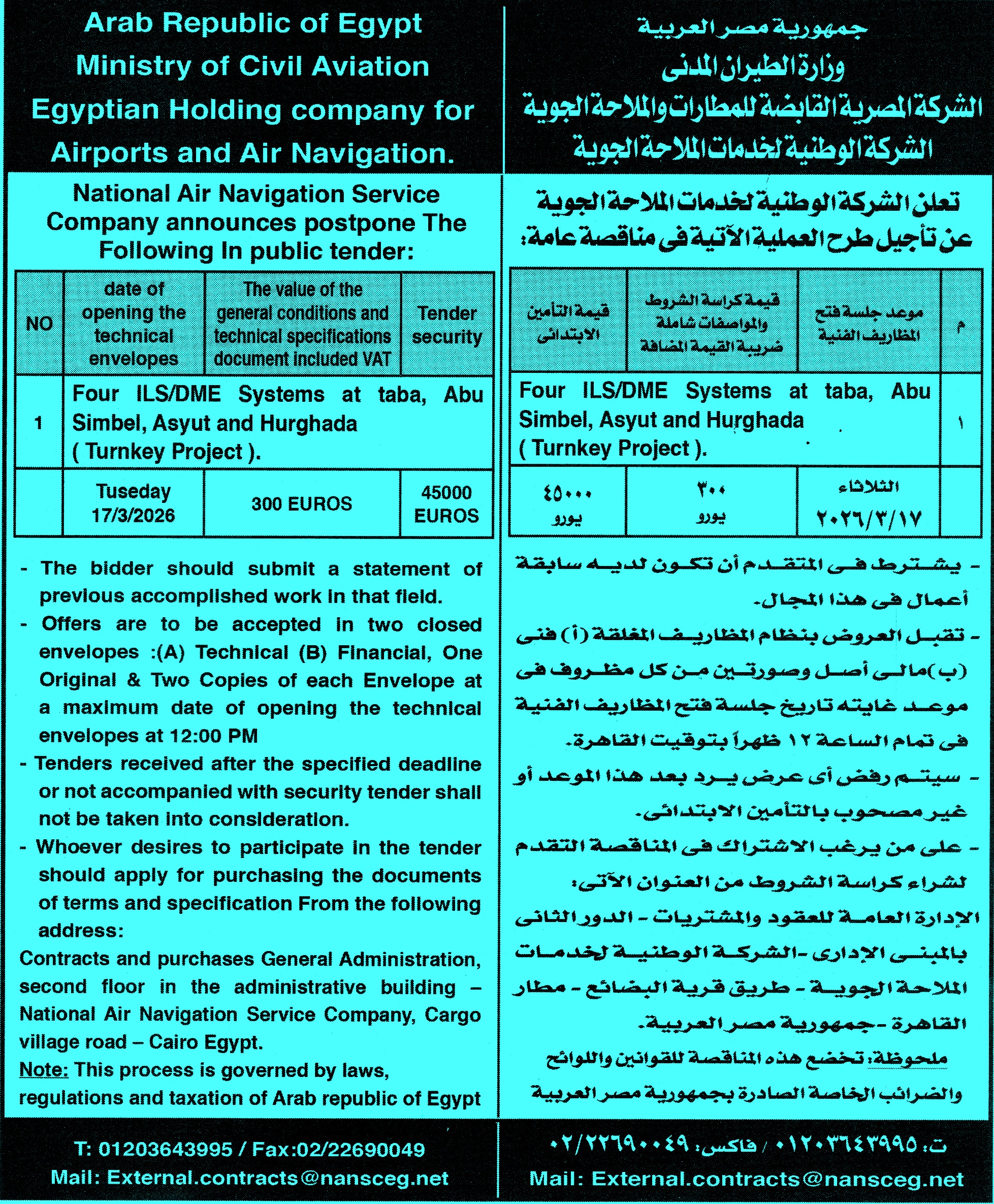 | البيان | تاجيل مناقصة عامة عن عملية Four ILS/DME Systems at Taba - Abu Simbel - Asyut and Hurghada ( Turnky Project ) ليصبح تاريخ فتح المظاريف 2026/3/17م لمتابعة المناقصات أول بأول على صفحتنا على الفيس بوك * الصورة خاصة بموقع مناقصات ايجي ولا يمكن تداولها |