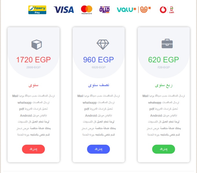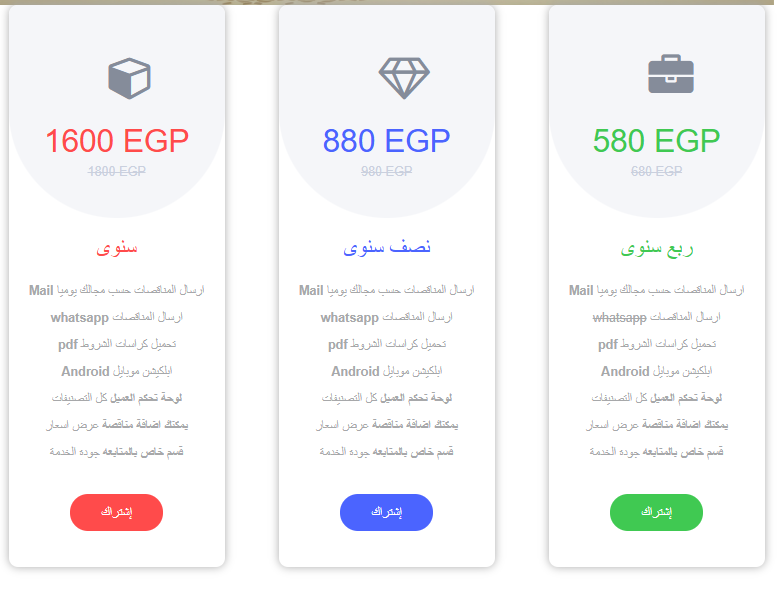الاشتراكات المدفوعة مميزات *لوحة تحكم لادارة حسابك وبياناتك وادارة اكثر من ميل وادارة التصنيفات *ارسال عبر الميل .. الموقع .. الابلكيشن *صفحة خاصة لمتابعة اعمالك ومناقصاتك السابقة *امكانية التحكم فى حسابك الخاص واضافة او تحميل مناقصة او تعديل واضافة بيانات كمورد او مقاول او استشارى . *سهولة اضافة او ازالة تصنيف من اكتر من 150 تصنيف عمل *متابعه جميع المناقصات الخاصه بك على الموقع وارسالها على الميل *الاطلاع على نسخه من كراسات الشروط والمقاياسات بنسبة تصل الى 80% من كراسة الشروط والمقايسات Pdf & wordامكانية تحميل ملف *jpgصورة من المناقصات المنشوره وامكانيه تحميلها
