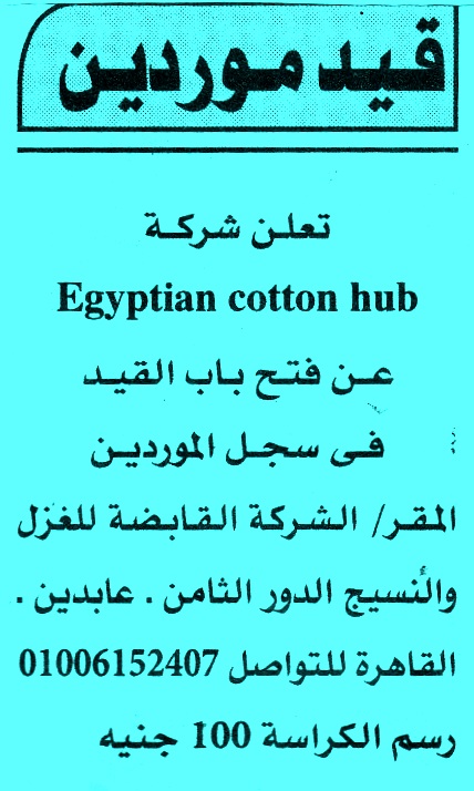 | فتح باب التسجيل بقيد الموردين لشركة Egyptian cotton hub مرفقة بالصور | |