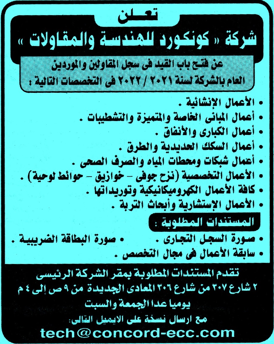 فتح باب التسجيل لسجل قيد الموردين لشركه كونكورد للهندسه والمقاولات