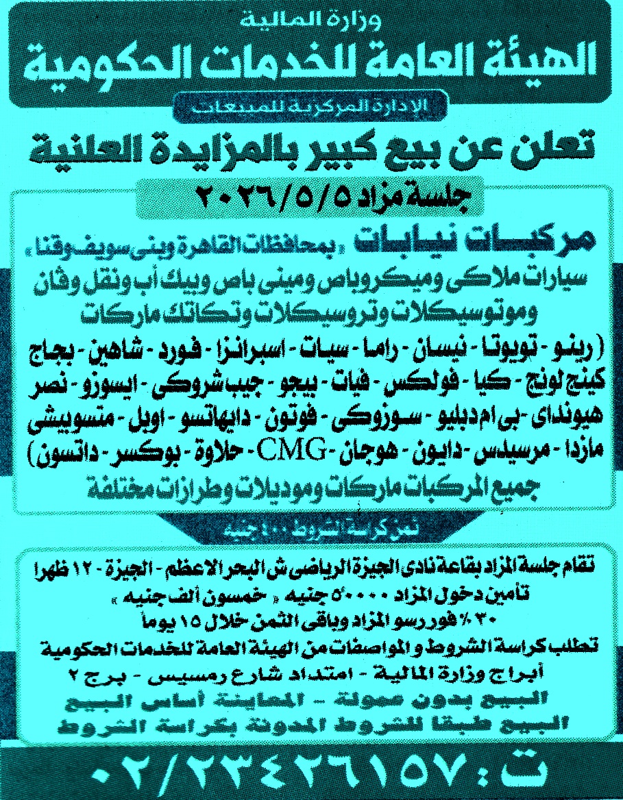 | مزايدة علنية عن عملية بيع مركبات نيابات بمحافظات القاهرة وبنى سويف وقنا | |