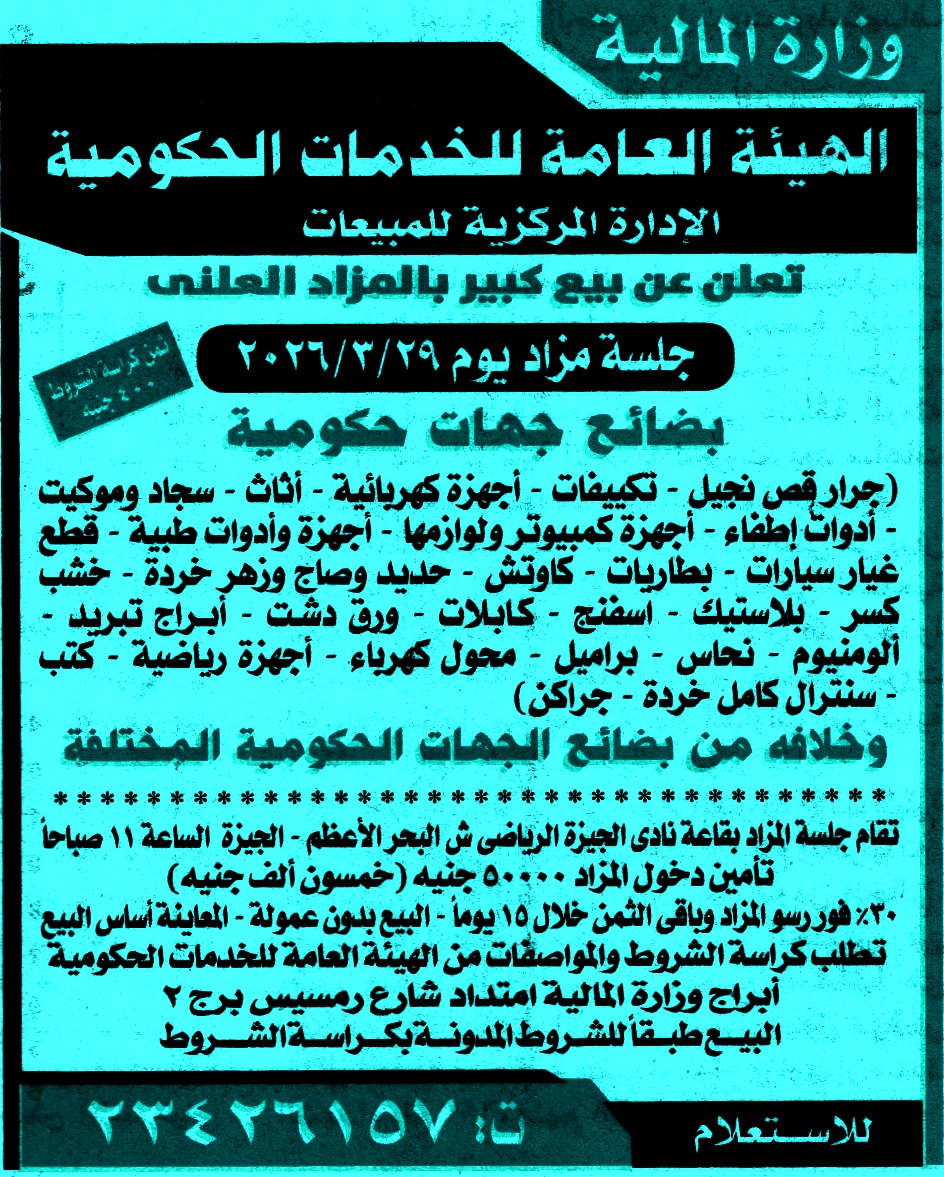| مزايده علنية للهيئة العامة للخدمات الحكوميه مرفقة بالصور | |