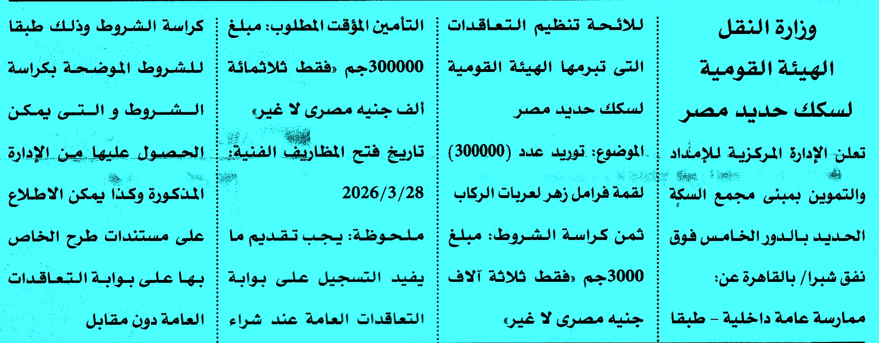 | البيان | ممارسة عامة داخلية عن عملية توريد عدد 300000 لقمة فرامل زهر لعربات الركاب لمتابعة المناقصات أول بأول على صفحتنا على الفيس بوك * الصورة خاصة بموقع مناقصات ايجي ولا يمكن تداولها |