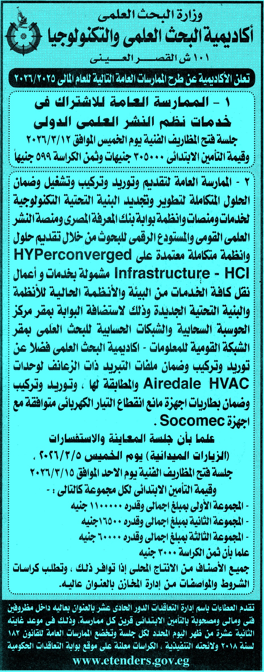 | تفاصيل اخرى | - جلسة الاستفسارات والمعاينة 2026/3/5م - www.etenders.gov.eg |