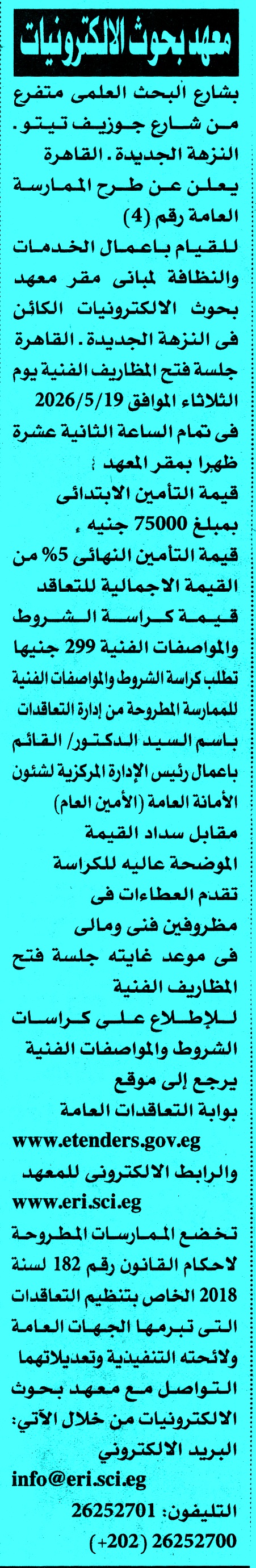 تفاصيل اخرى - يزيد التامين النهائي 5% عند الرسو - بوابة التعاقدات العامة : www.etenders.gov.eg - الرابط الالكتروني للمعهد : www.eri.sci.eg - البريد الالكتروني : [email protected]