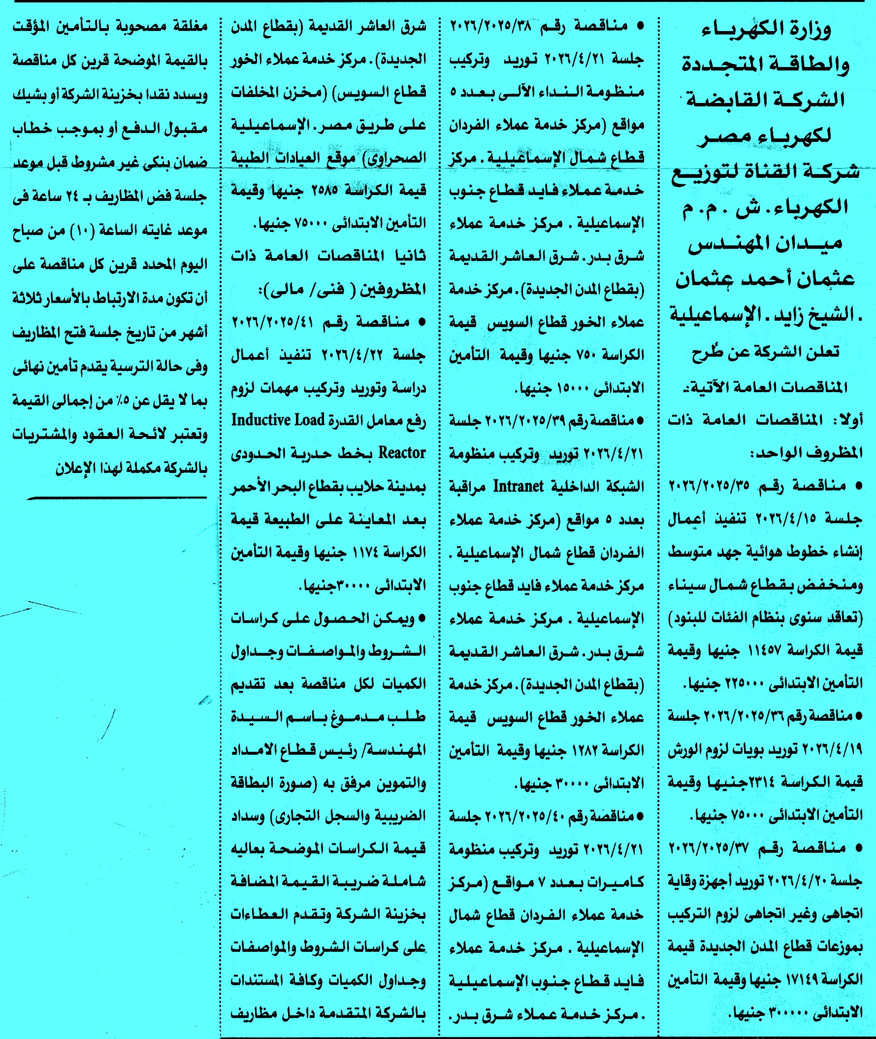 مناقصات عامة لشركة القناة لتوزيع الكهرباء ش م م مرفق بالصور