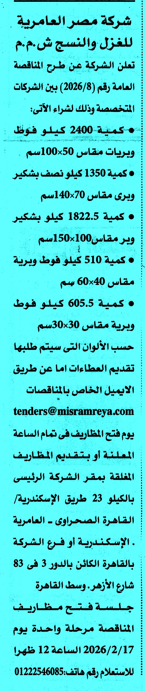 | مناقصات عامة لشركة مصر العامرية للغزل والنسج ش.م.م مرفق بالصور | |