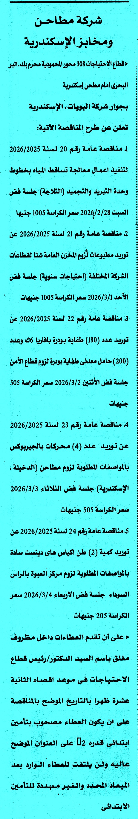 | مناقصات عامة لشركة مطاحن ومخابز الاسكندرية مرفقه بالصور | |