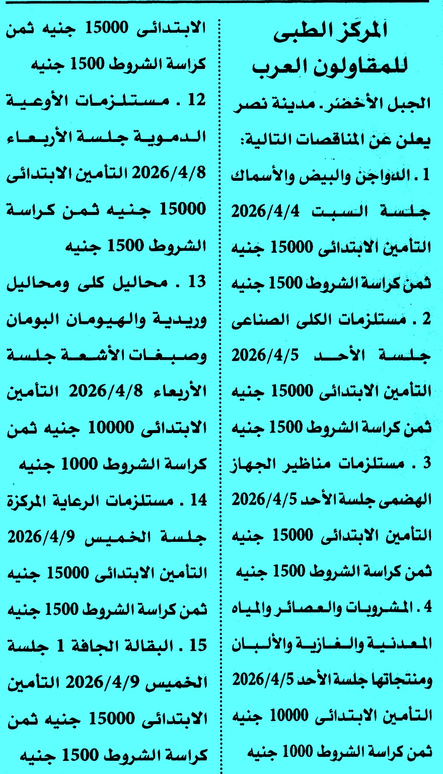 مناقصات عامة للمركز الطبي للمقاولون العرب مرفق بالصور