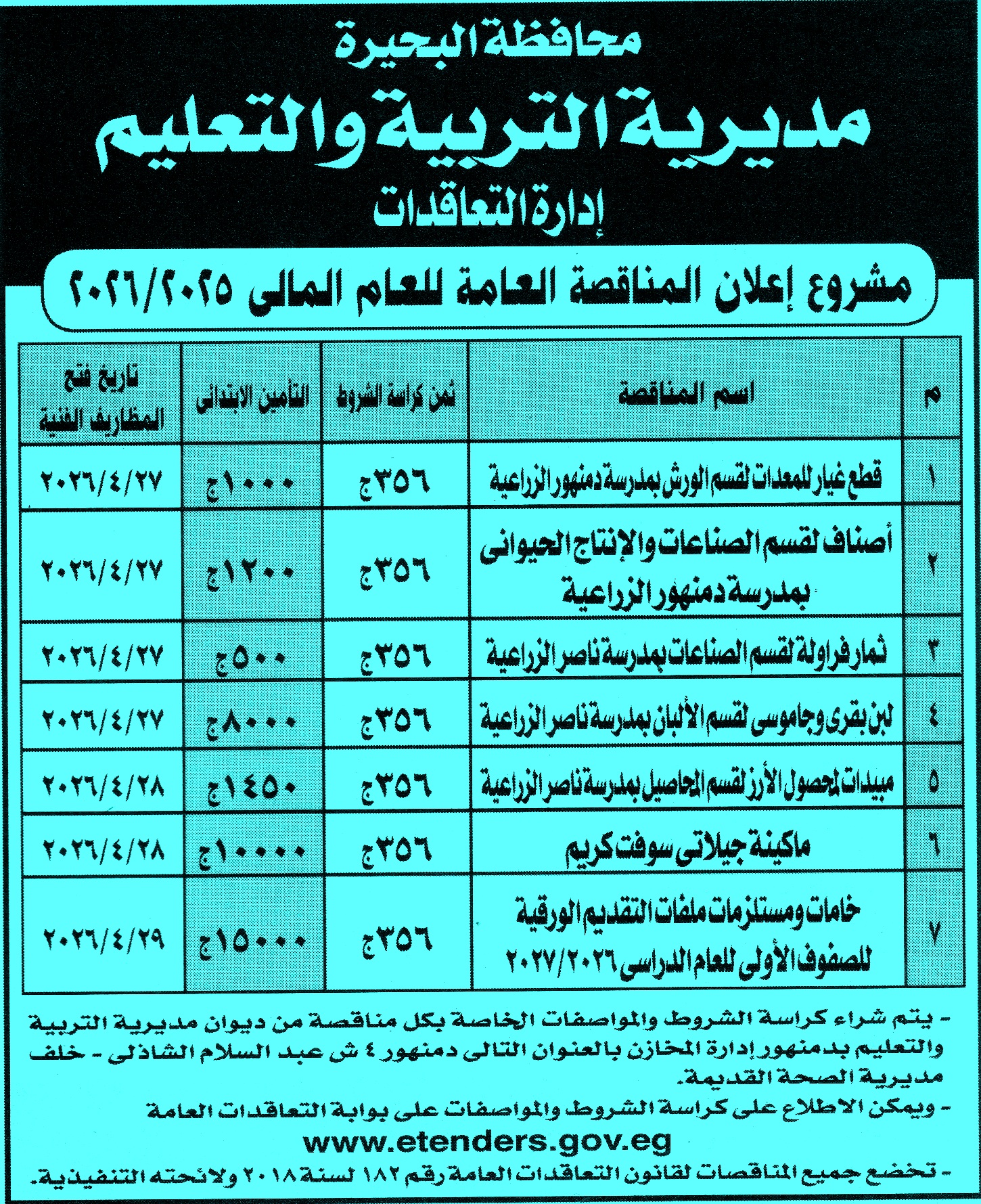 لمتابعة المناقصات أول بأول على صفحتنا على الفيس بوك * الصورة خاصة بموقع مناقصات ايجي ولا يمكن تداولها |