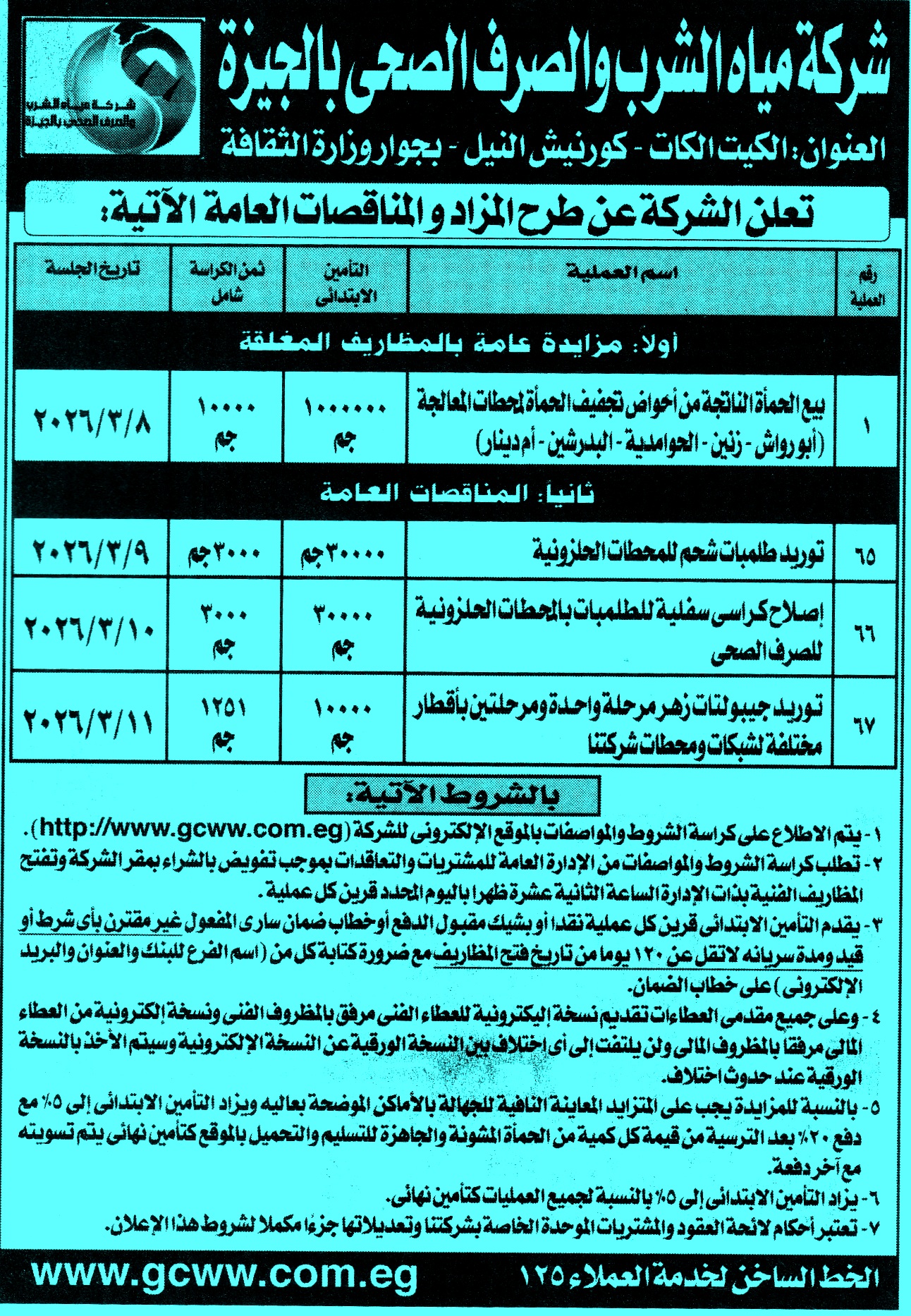 مناقصات ومزايدات عامة لشركة مياه الشرب والصرف الصحى بالجيزة مرفق بالصور