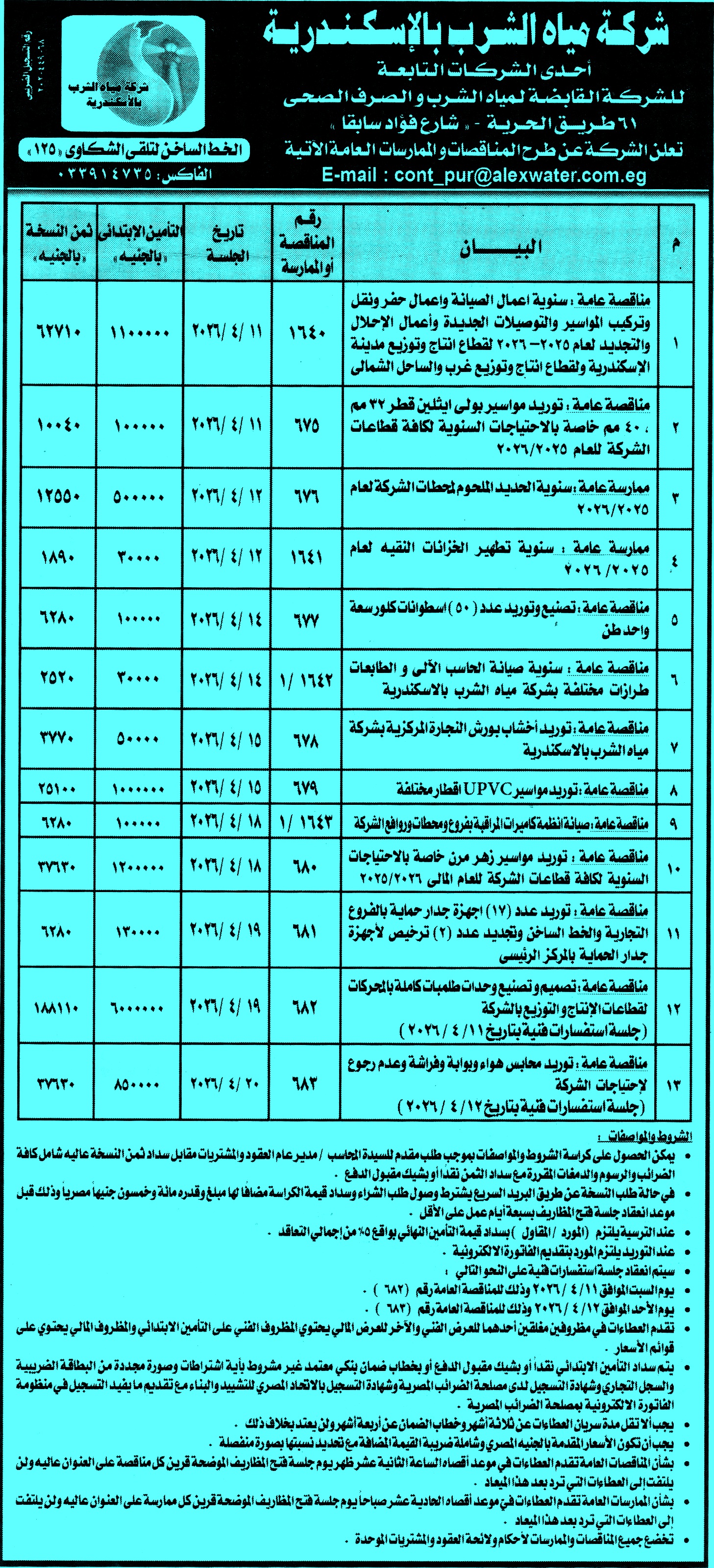 مناقصات وممارسات عامة لشركة مياه الشرب بالاسكندرية مرفق بالصور
