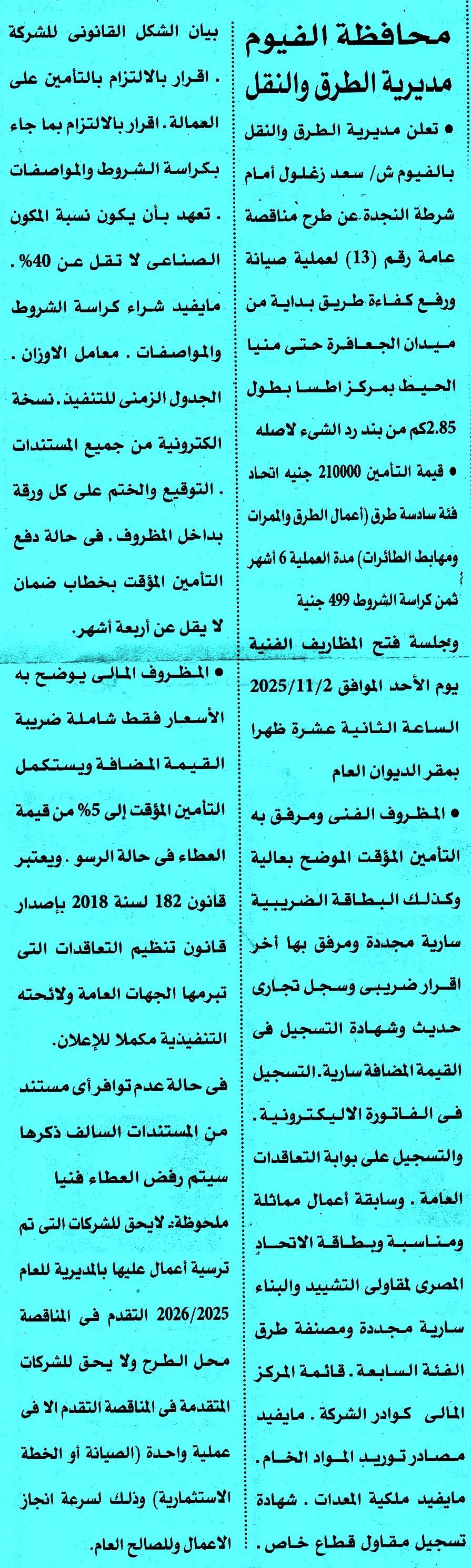 البيان | مناقصة عامة رقم 13 عن عملية صيانة ورفع كفاءة طريق بداية من ميدان الجعافرة حتى منيا الحيط بمركز اطسا بطول 2.85 كم من بند رد الشئ لاصله لمتابعة المناقصات أول بأول على صفحتنا على الفيس بوك * الصورة خاصة بموقع مناقصات ايجي ولا يمكن تداولها |