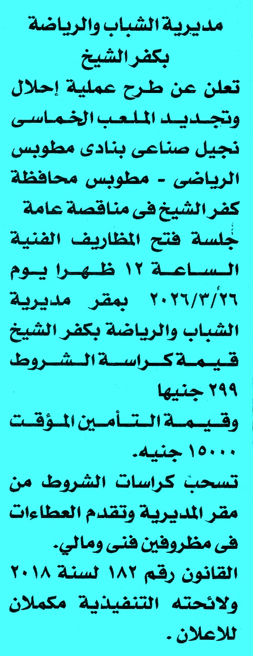 | مناقصة عامة عن عملية احلال وتجديد الملعب الخماسي نجيل صناعى بنادى مطوبس الرياضي | |