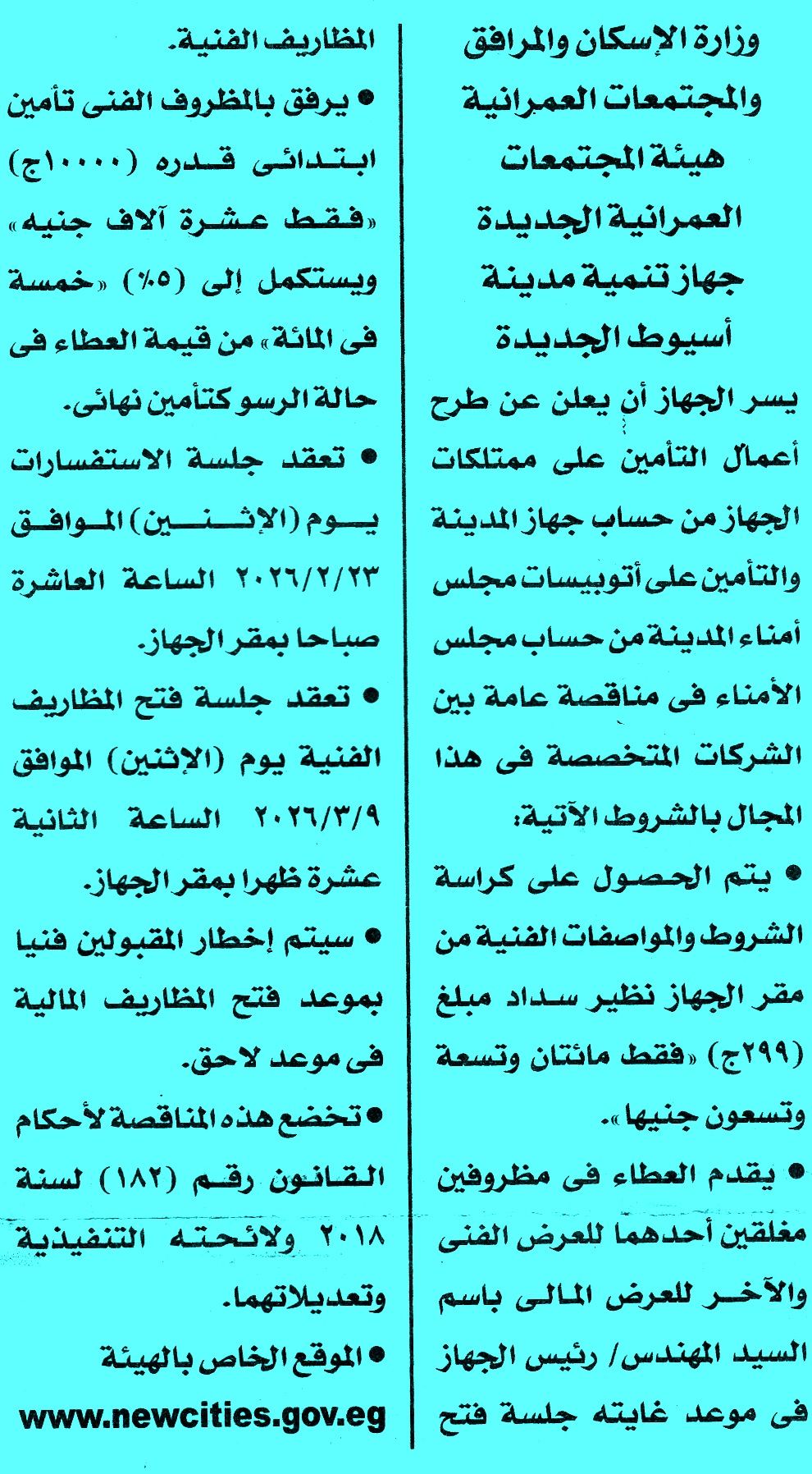 | تفاصيل اخرى | - جلسة الاستفسارات 2026/2/23م - يزيد التامين النهائي 5% عند الرسو - الموقع الخاص بالهيئة : www.newcities.gov.eg |