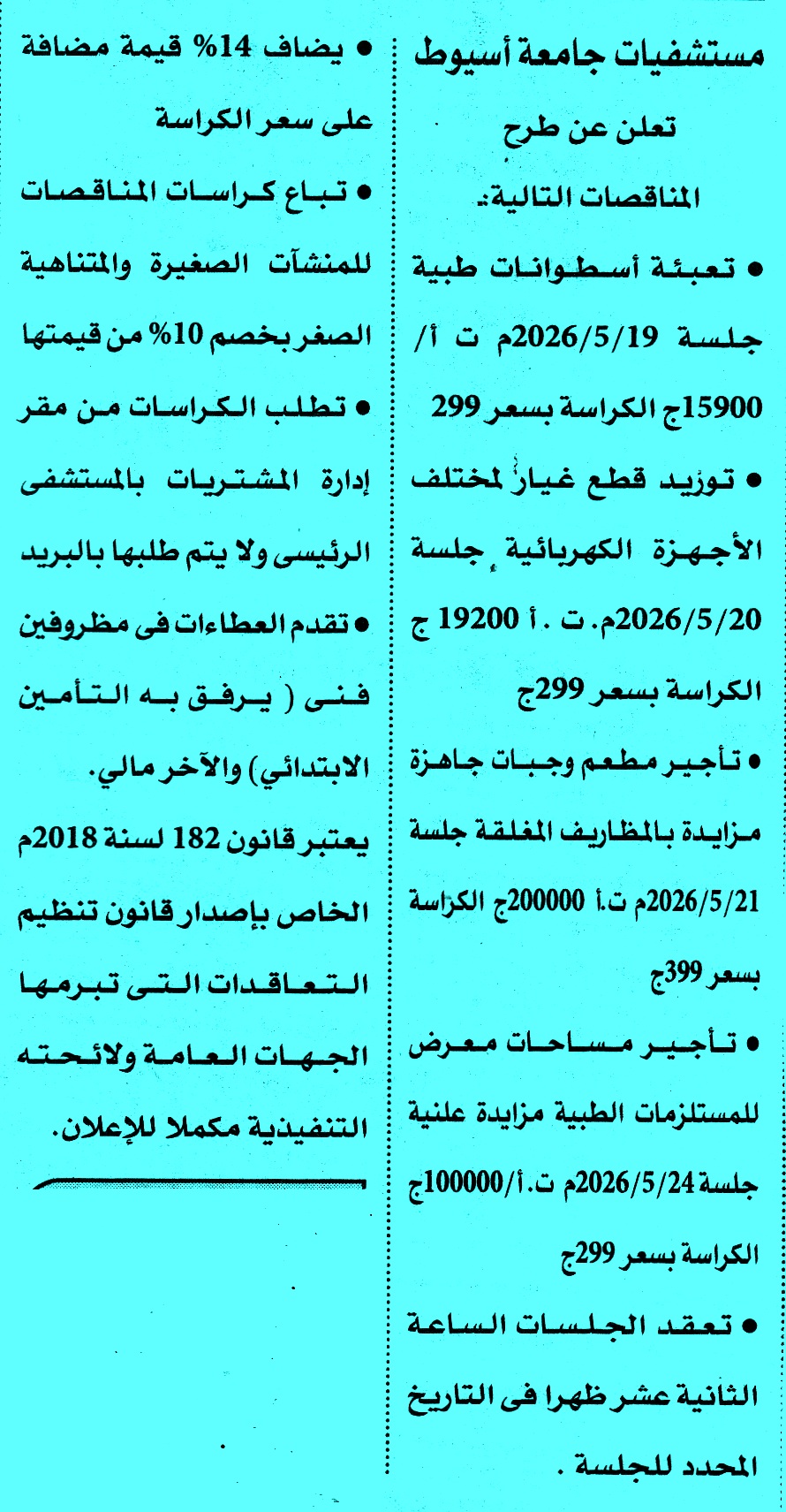 | البيان | مناقصة عامة عن عملية تعبئة اسطوانات طبية لمتابعة المناقصات أول بأول على صفحتنا على الفيس بوك https://www.facebook.com/tenderseg.eg https://www.youtube.com/watch?v=nQn9BZhMG_w * الصورة خاصة بموقع مناقصات ايجي ولا يمكن تداولها |
