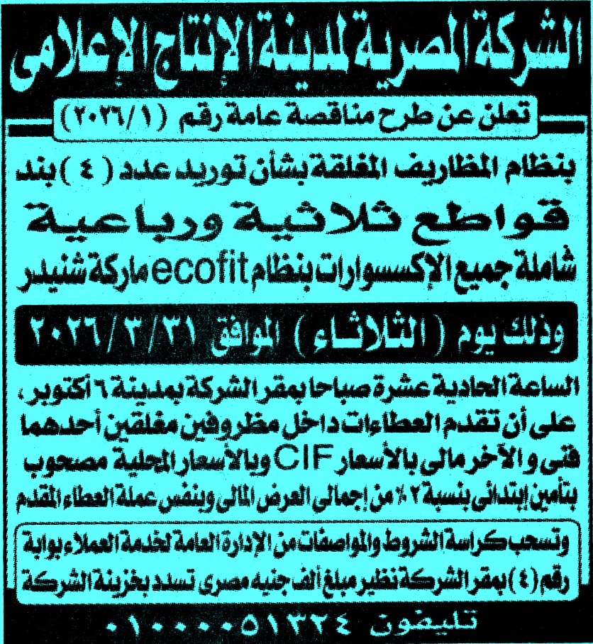 | البيان | مناقصة عامة رقم 2026/1 عن عملية توريد عدد 4 بند قواطع ثلاثية ورباعية شاملة جميع اكسسورات بنظام ecofit ماركة شنيدر لمتابعة المناقصات أول بأول على صفحتنا على الفيس بوك * الصورة خاصة بموقع مناقصات ايجي ولا يمكن تداولها |