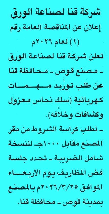 | البيان | مناقصة عامة رقم 1 لعام 2026 عن عملية توريد مهمات كهربائية سلك نحاس معزول وكشافات وخلافه لمتابعة المناقصات أول بأول على صفحتنا على الفيس بوك * الصورة خاصة بموقع مناقصات ايجي ولا يمكن تداولها |