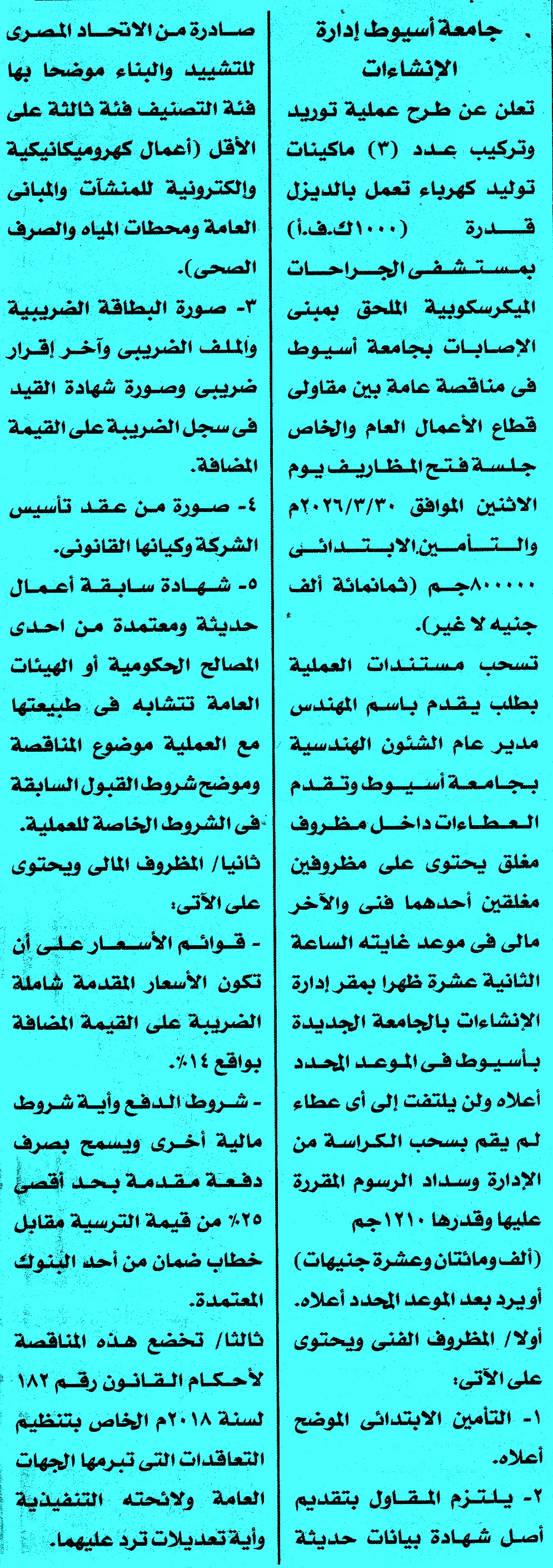 | مناقصة عامة عن عملية توريد وتركيب عدد 3 ماكينات توليد كهرباء تعمل بالديزل قدرة 1000 ك ف أ | |