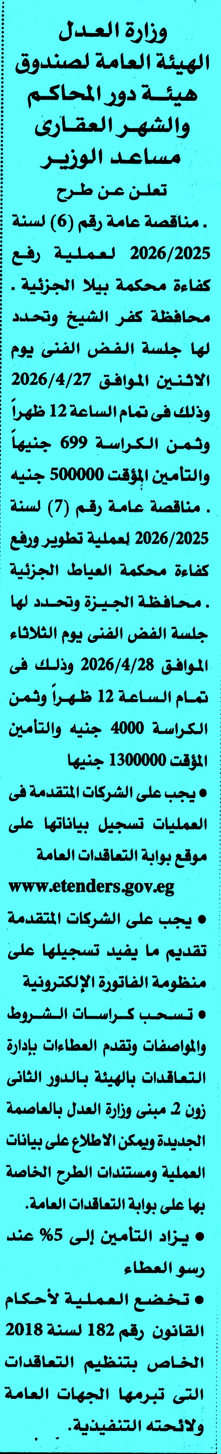 | البيان | مناقصة عامة رقم (6) لسنة 2026/2025 عن عملية رفع كفاءة محكمة بيلا الجزئية - محافظة كفرالشيخ لمتابعة المناقصات أول بأول على صفحتنا على الفيس بوك * الصورة خاصة بموقع مناقصات ايجي ولا يمكن تداولها |