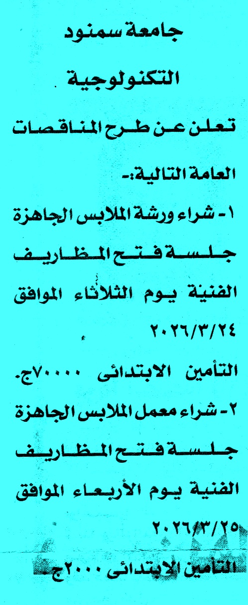 | البيان | مناقصة عامة عن عملية شراء معمل الملابس الجاهزة لمتابعة المناقصات أول بأول على صفحتنا على الفيس بوك * الصورة خاصة بموقع مناقصات ايجي ولا يمكن تداولها |