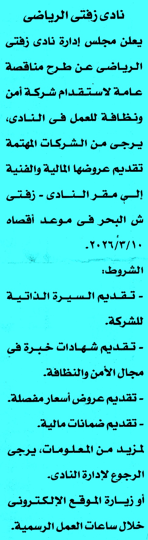 | مناقصة عامة عن عملية لاستقدام شركة امن ونظافة للعمل في النادى | |