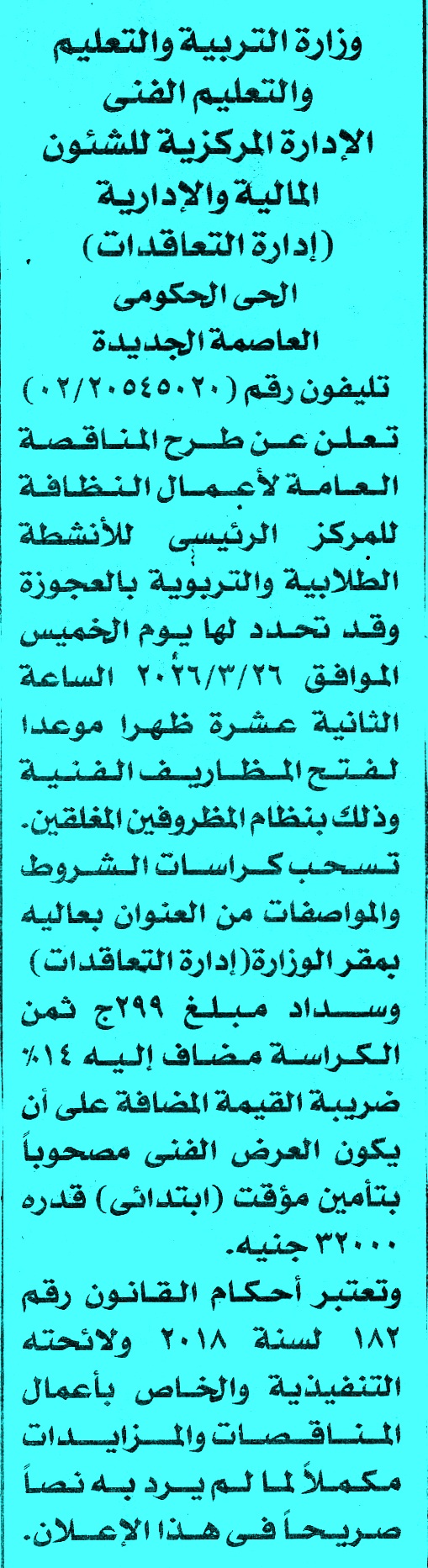 | البيان | مناقصة عامة عن عملية لاعمال النظافة للمركز الرئيسي للانشطة الطلابية والتربوية بالعجوزة لمتابعة المناقصات أول بأول على صفحتنا على الفيس بوك * الصورة خاصة بموقع مناقصات ايجي ولا يمكن تداولها |