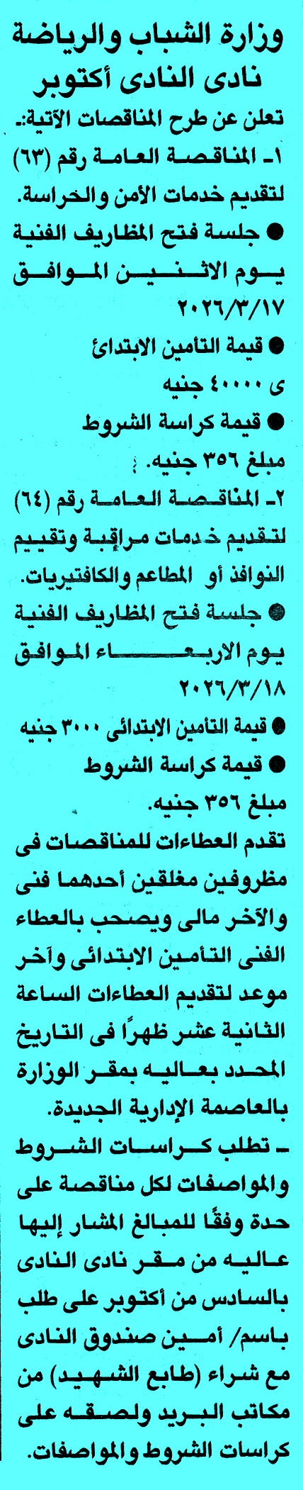 | البيان | مناقصة عامة رقم 64 عن عملية لتقديم خدمات مراقبة وتقييم النوافذ او المطاعم والكافتيريات لمتابعة المناقصات أول بأول على صفحتنا على الفيس بوك * الصورة خاصة بموقع مناقصات ايجي ولا يمكن تداولها |