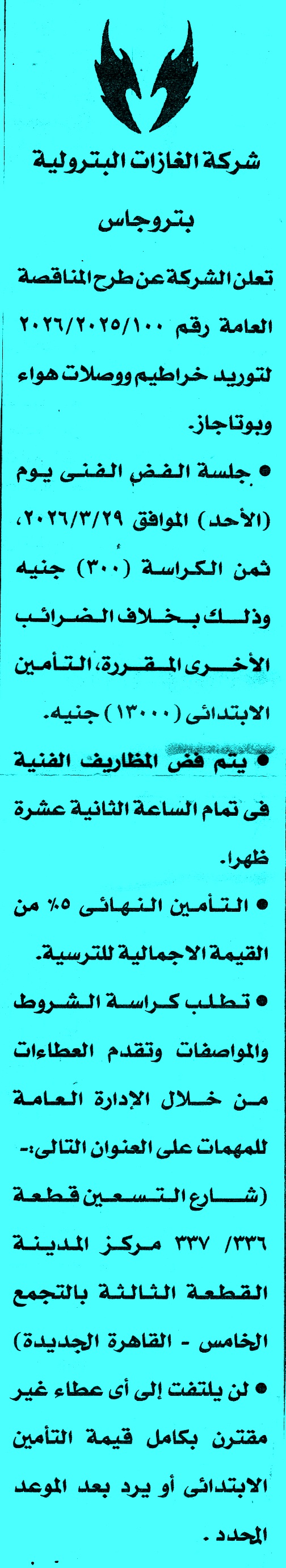 مناقصة عامة رقم 2026/2025/100 عن عملية لتوريد خراطيم ووصلات هواء وبوتاجاز