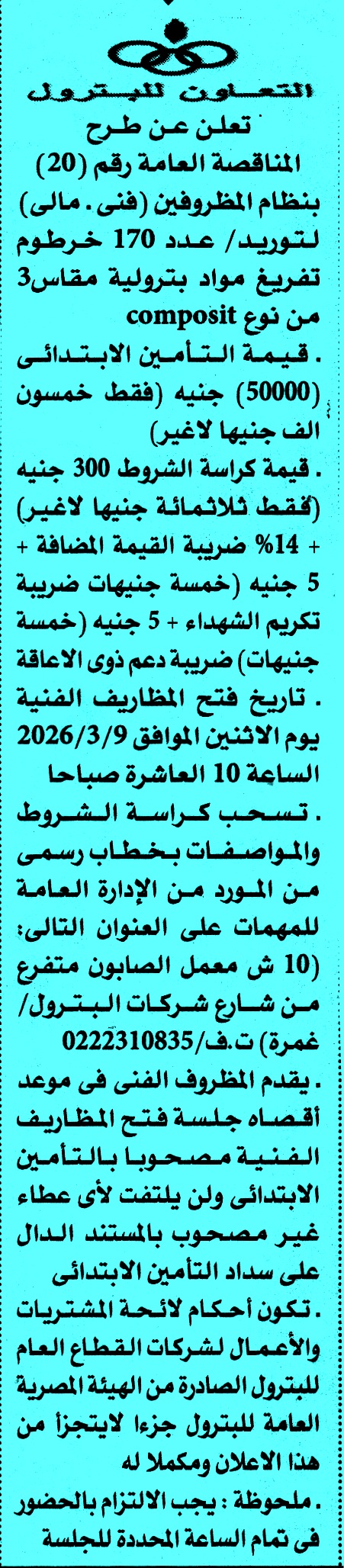 | البيان | مناقصة عامة رقم (20) عن عملية لتوريد عدد 170 خرطوم تفريغ مواد بترولية مقاس 3 من نوع composit لمتابعة المناقصات أول بأول على صفحتنا على الفيس بوك * الصورة خاصة بموقع مناقصات ايجي ولا يمكن تداولها |