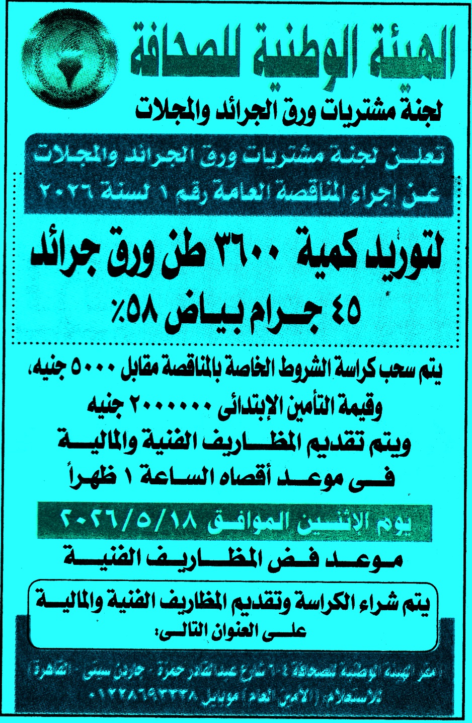 | البيان | مناقصة عامة رقم 1 لسنة 2026 عن عملية لتوريد كمية 3600 طن ورق جرائد 45 جرام بياض 58 % لمتابعة المناقصات أول بأول على صفحتنا على الفيس بوك https://www.facebook.com/tenderseg.eg https://www.youtube.com/watch?v=nQn9BZhMG_w * الصورة خاصة بموقع مناقصات ايجي ولا يمكن تداولها |