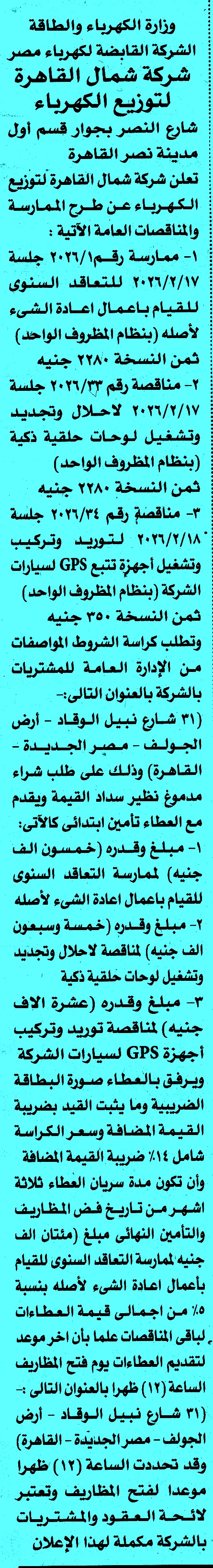 | البيان | مناقصة عامة رقم 2026/34 عن عملية لتوريد وتركيب وتشغيل اجهزة تتبع GPS لسيارات الشركة لمتابعة المناقصات أول بأول على صفحتنا على الفيس بوك * الصورة خاصة بموقع مناقصات ايجي ولا يمكن تداولها |