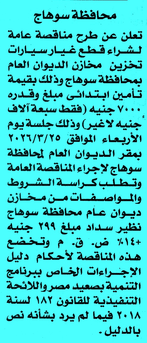 | مناقصة عامة عن عملية لشراء قطع غيار سيارات تخزين مخازن الديوان العام بمحافظة سوهاج | |